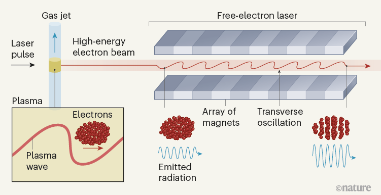 Various teams are concentrating on finding the conditions for stable and reliable acceleration of an electron beam that is sufficiently monochromatic for FEL amplification9. Wang et al. have demonstrated, for the first time, that this amplification can be achieved using electrons accelerated in a laser-excited plasma wave (Fig. 1). The authors produced the plasma wave by firing a laser pulse at a gas jet that had a diameter of only 6 mm. By manipulating the density of the gas, they shaped the plasma density along the acceleration direction and loaded electrons from the plasma into the accelerating phase of the plasma wave. This technique ensured that the generated beam, with an energy of about 0.5 GeV, was of sufficient quality to amplify radiation in an extreme-ultraviolet FEL at an output wavelength of 27 nm.