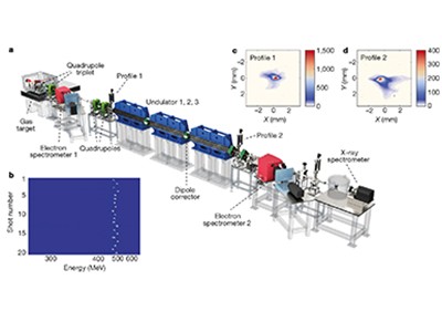 Electron beams are normally accelerated by injecting the electrons into a long sequence of hollow metal structures called resonant cavities, where the particles progressively gain energy by ‘surfing’ an electromagnetic wave. The final energy depends on the amplitude of the wave (that is, the strength of the accelerating field) and the length of the accelerator. Present technology limits the field strength in accelerating cavities to a few tens of megavolts per metre. Therefore, an accelerator several hundred metres to a few kilometres in length is required to reach the beam energy of several gigaelectronvolts (GeV) needed by an X-ray FEL. High-energy electron beams therefore tend to be available only at large accelerator facilities, limiting the number of scientists who can access FELs or advanced investigation tools needing high-energy electrons.